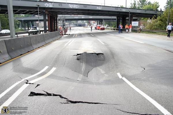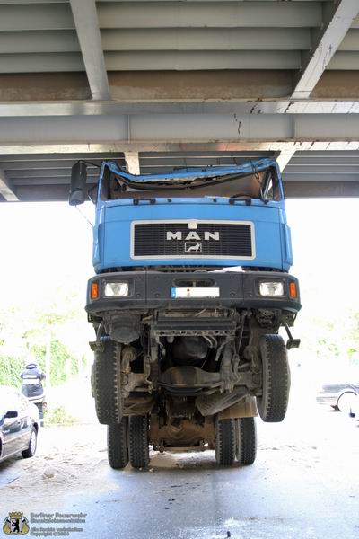 lustige Bild von einem Laster, der zu groß war um unter ner Brücke durchzufahren. Oder das, was ist, wenn eine Autobahn plötzlich eine